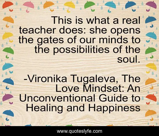 This page presents the quote "This is what a real teacher does: she opens the gates of our minds to the possibilities of the soul.". Author of this quote is Vironika Tugaleva, The Love Mindset: An Unconventional Guide to Healing and Happiness. This quote is about mind, soul, possibility, teaching, teacher, live-by-example, mindset,.