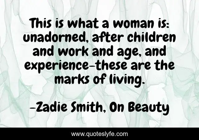 This page presents the quote "This is what a woman is: unadorned, after children and work and age, and experience-these are the marks of living.". Author of this quote is Zadie Smith, On Beauty. This quote is about love, women-s-strength, beauty, affection,.