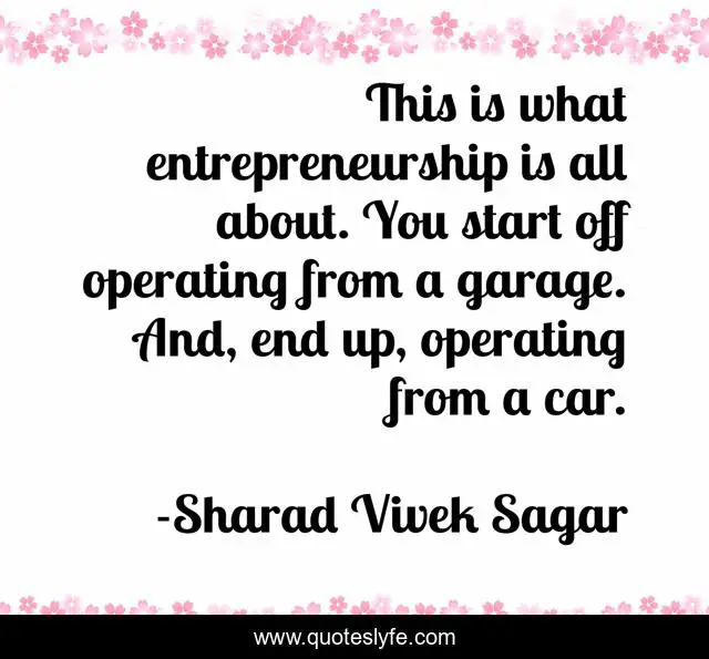 This page presents the quote "This is what entrepreneurship is all about. You start off operating from a garage. And, end up, operating from a car.". Author of this quote is Sharad Vivek Sagar. This quote is about impact, entrepreneurs, social-impact, entrepreneurship, garage, inspirational, enthusiasm, startups, social-entrepreneurship,.