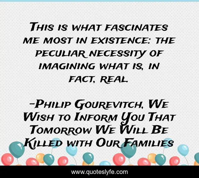 This page presents the quote "This is what fascinates me most in existence: the peculiar necessity of imagining what is, in fact, real.". Author of this quote is Philip Gourevitch, We Wish to Inform You That Tomorrow We Will Be Killed with Our Families. This quote is about imagining, life, reality,.