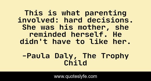 This page presents the quote "This is what parenting involved: hard decisions. She was his mother, she reminded herself. He didn't have to like her.". Author of this quote is Paula Daly, The Trophy Child. .
