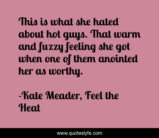 This page presents the quote "This is what she hated about hot guys. That warm and fuzzy feeling she got when one of them anointed her as worthy.". Author of this quote is Kate Meader, Feel the Heat. This quote is about what-a-girl-wants, hot-guys, self-worth,.