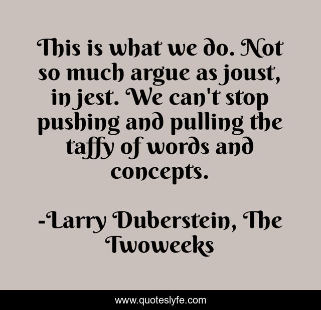 This page presents the quote "This is what we do. Not so much argue as joust, in jest. We can't stop pushing and pulling the taffy of words and concepts.". Author of this quote is Larry Duberstein, The Twoweeks. This quote is about ideal-relationship, relationships, lovers, love, arguments, friendship, affection,.