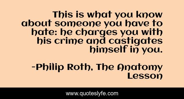 This page presents the quote "This is what you know about someone you have to hate: he charges you with his crime and castigates himself in you.". Author of this quote is Philip Roth, The Anatomy Lesson. This quote is about hate, crime,.
