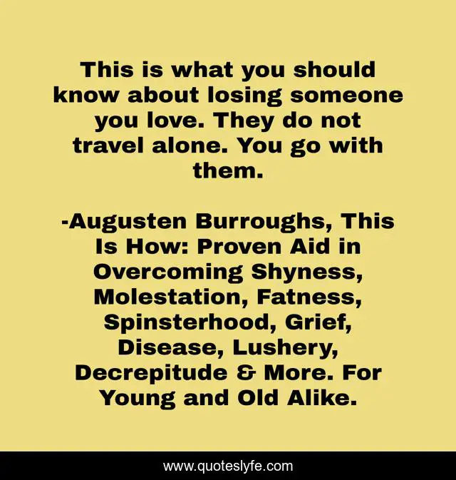 This page presents the quote "This is what you should know about losing someone you love. They do not travel alone. You go with them.". Author of this quote is Augusten Burroughs, This Is How: Proven Aid in Overcoming Shyness, Molestation, Fatness, Spinsterhood, Grief, Disease, Lushery, Decrepitude & More. For Young and Old Alike.. This quote is about love, greif, healing, inspirational, enthusiasm, affection,.
