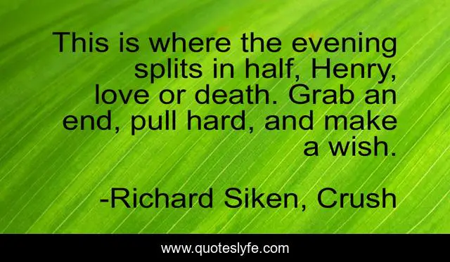 This page presents the quote "This is where the evening splits in half, Henry, love or death. Grab an end, pull hard, and make a wish.". Author of this quote is Richard Siken, Crush. This quote is about death, love, affection,.