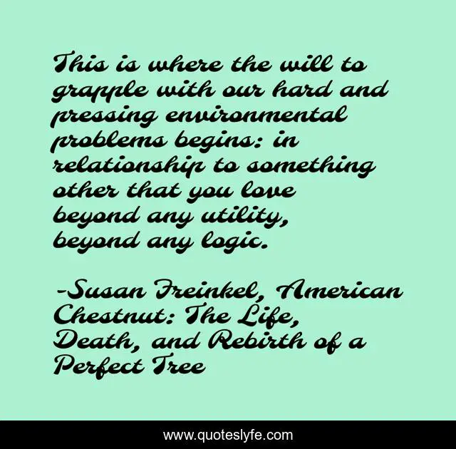 This page presents the quote "This is where the will to grapple with our hard and pressing environmental problems begins: in relationship to something other that you love beyond any utility, beyond any logic.". Author of this quote is Susan Freinkel, American Chestnut: The Life, Death, and Rebirth of a Perfect Tree. This quote is about environment, ecology, empathy,.