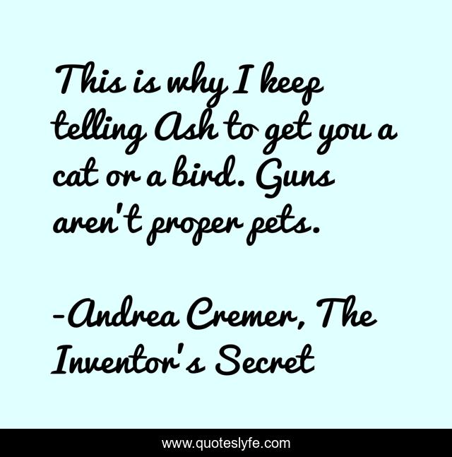 This page presents the quote "This is why I keep telling Ash to get you a cat or a bird. Guns aren't proper pets.". Author of this quote is Andrea Cremer, The Inventor's Secret. This quote is about humor, violence, young-adult, guns, pets,.