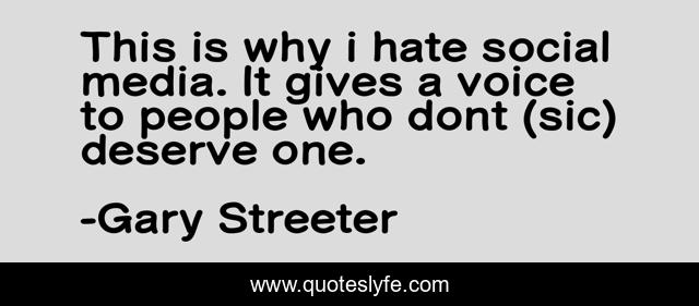 This page presents the quote "This is why i hate social media. It gives a voice to people who dont (sic) deserve one.". Author of this quote is Gary Streeter. This quote is about social-media, having-a-voice, voiceless, silencing-others, inequality, silencing-dissent,.
