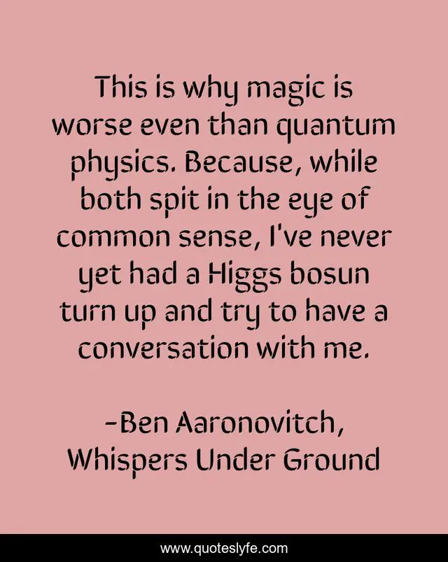 This page presents the quote "This is why magic is worse even than quantum physics. Because, while both spit in the eye of common sense, I've never yet had a Higgs bosun turn up and try to have a conversation with me.". Author of this quote is Ben Aaronovitch, Whispers Under Ground. This quote is about magic, physics,.