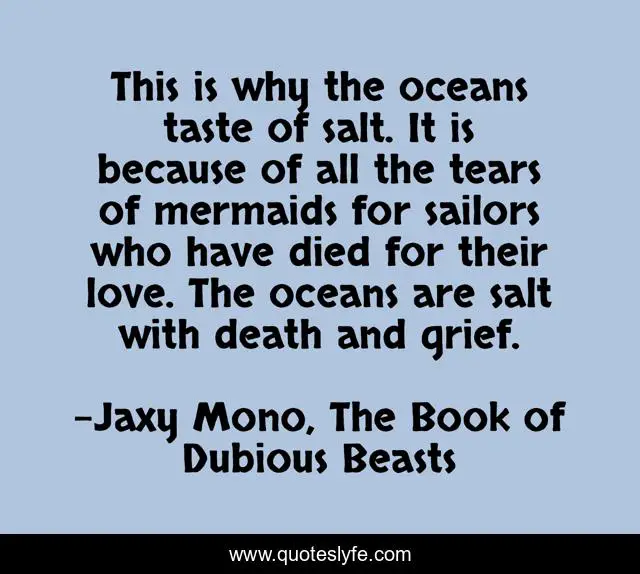 This page presents the quote "This is why the oceans taste of salt. It is because of all the tears of mermaids for sailors who have died for their love. The oceans are salt with death and grief.". Author of this quote is Jaxy Mono, The Book of Dubious Beasts. This quote is about mermaids, death, ocean,.