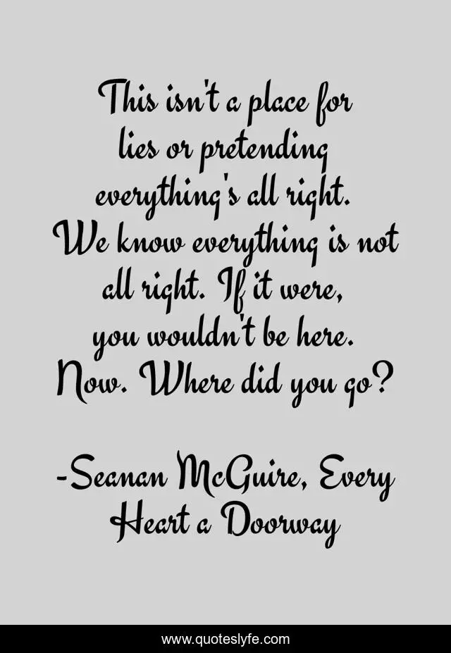 This page presents the quote "This isn't a place for lies or pretending everything's all right. We know everything is not all right. If it were, you wouldn't be here. Now. Where did you go?". Author of this quote is Seanan McGuire, Every Heart a Doorway. .