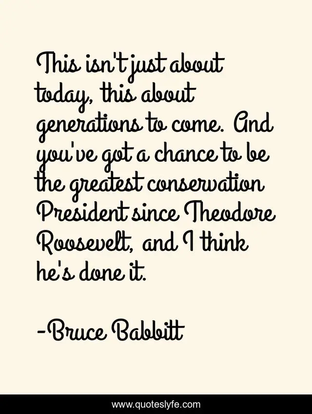 This page presents the quote "This isn't just about today, this about generations to come. And you've got a chance to be the greatest conservation President since Theodore Roosevelt, and I think he's done it.". Author of this quote is Bruce Babbitt. This quote is about greatest, today, think,.