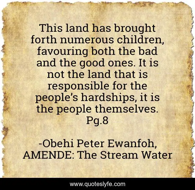 This page presents the quote "This land has brought forth numerous children, favouring both the bad and the good ones. It is not the land that is responsible for the people’s hardships, it is the people themselves. Pg.8". Author of this quote is Obehi Peter Ewanfoh, AMENDE: The Stream Water. This quote is about land-children, people-s-hardships, africa, oral-tradition, amende-the-stream-water, esan, narration, nigeria, the-bad-and-the-good-ones,.