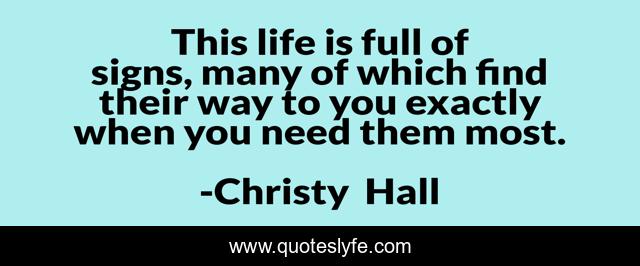 This page presents the quote "This life is full of signs, many of which find their way to you exactly when you need them most.". Author of this quote is Christy Hall. .