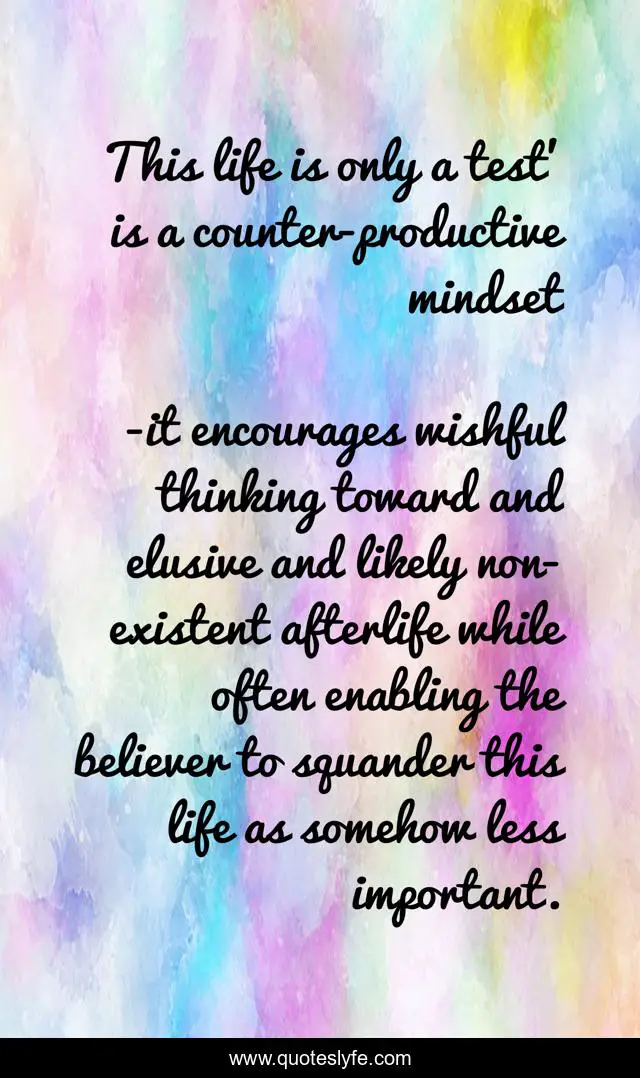 This page presents the quote "This life is only a test' is a counter-productive mindset". Author of this quote is it encourages wishful thinking toward and elusive and likely non-existent afterlife while often enabling the believer to squander this life as somehow less important.. This quote is about dad, david g. mcafee, i'm an atheist: the guide to coming out as a non-believer, mom,.