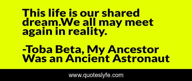 This page presents the quote "This life is our shared dream.We all may meet again in reality.". Author of this quote is Toba Beta, My Ancestor Was an Ancient Astronaut. This quote is about life, shared-dream, truth, reality,.