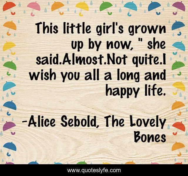 This page presents the quote "This little girl's grown up by now, " she said.Almost.Not quite.I wish you all a long and happy life.". Author of this quote is Alice Sebold, The Lovely Bones. This quote is about beautiful, heartfelt, life, crying, sad,.