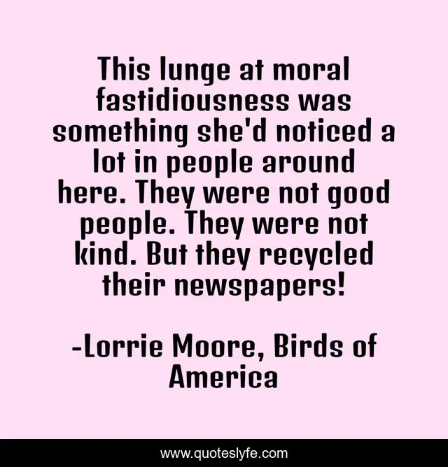 This page presents the quote "This lunge at moral fastidiousness was something she'd noticed a lot in people around here. They were not good people. They were not kind. But they recycled their newspapers!". Author of this quote is Lorrie Moore, Birds of America. .