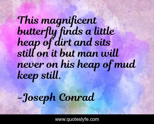This page presents the quote "This magnificent butterfly finds a little heap of dirt and sits still on it but man will never on his heap of mud keep still.". Author of this quote is Joseph Conrad. This quote is about butterfly, mud, man,.