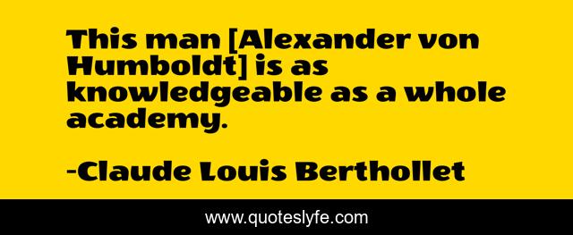 This page presents the quote "This man [Alexander von Humboldt] is as knowledgeable as a whole academy.". Author of this quote is Claude Louis Berthollet. This quote is about admiration, alexander-von-humboldt, scientist, praise, honor, recognition, knowledge,.