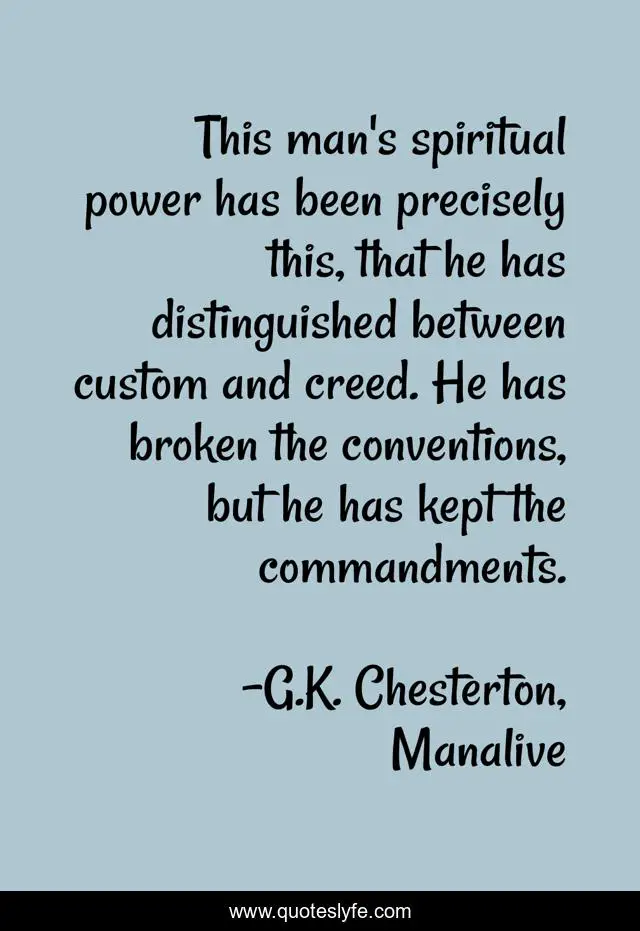 This page presents the quote "This man's spiritual power has been precisely this, that he has distinguished between custom and creed. He has broken the conventions, but he has kept the commandments.". Author of this quote is G.K. Chesterton, Manalive. This quote is about spirituality, creed, commandments, power, custom,.