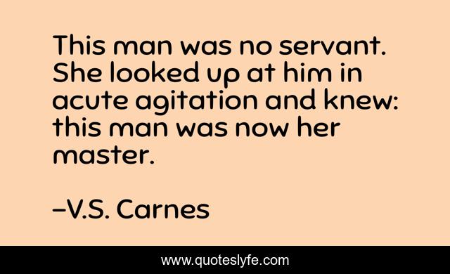 This page presents the quote "This man was no servant. She looked up at him in acute agitation and knew: this man was now her master.". Author of this quote is V.S. Carnes. This quote is about christian, historical-romance,.