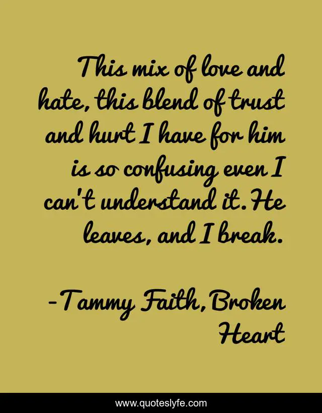 This page presents the quote "This mix of love and hate, this blend of trust and hurt I have for him is so confusing even I can't understand it.He leaves, and I break.". Author of this quote is Tammy Faith, Broken Heart. This quote is about feelings-of-weakness, trust, love, affection,.