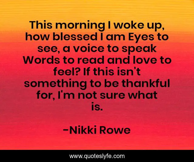 This page presents the quote "This morning I woke up, how blessed I am Eyes to see, a voice to speak Words to read and love to feel? If this isn't something to be thankful for, I'm not sure what is.". Author of this quote is Nikki Rowe. This quote is about gratitude, freedom-of-speech, love, freedom, quotes, truth, quote-of-the-day, affection,.