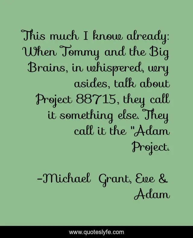 This page presents the quote "This much I know already: When Tommy and the Big Brains, in whispered, wry asides, talk about Project 88715, they call it something else. They call it the "Adam Project.". Author of this quote is Michael Grant, Eve & Adam. This quote is about ya, suspense, sci-fi,.