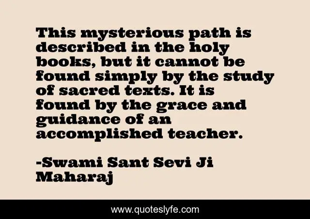 This page presents the quote "This mysterious path is described in the holy books, but it cannot be found simply by the study of sacred texts. It is found by the grace and guidance of an accomplished teacher.". Author of this quote is Swami Sant Sevi Ji Maharaj. This quote is about satguru, sant, sant-mat, master, spiritual-teacher,.