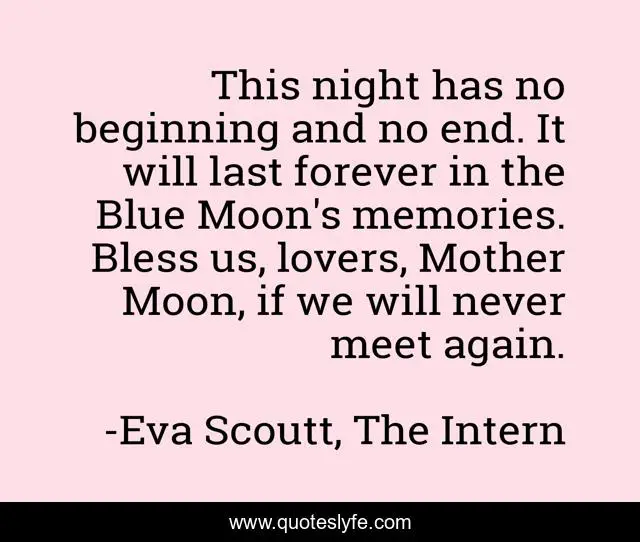 This page presents the quote "This night has no beginning and no end. It will last forever in the Blue Moon's memories. Bless us, lovers, Mother Moon, if we will never meet again.". Author of this quote is Eva Scoutt, The Intern. This quote is about lovers, love, lovers-sadness, affection, blue-moon,.