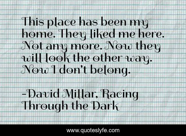 This page presents the quote "This place has been my home. They liked me here. Not any more. Now they will look the other way. Now I don't belong.". Author of this quote is David Millar, Racing Through the Dark. .