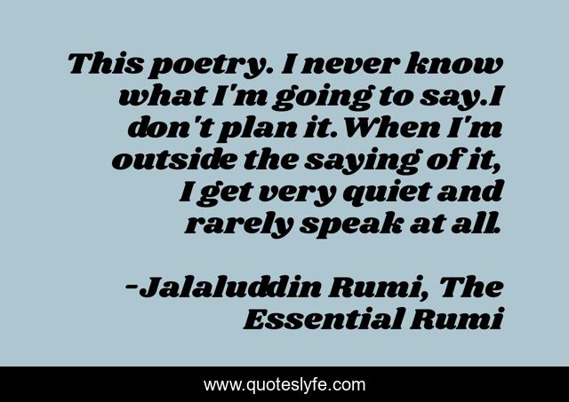 This page presents the quote "This poetry. I never know what I'm going to say.I don't plan it.When I'm outside the saying of it, I get very quiet and rarely speak at all.". Author of this quote is Jalaluddin Rumi, The Essential Rumi. This quote is about poetry, silence,.
