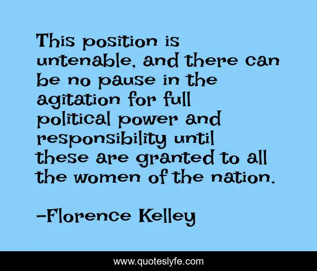 This page presents the quote "This position is untenable, and there can be no pause in the agitation for full political power and responsibility until these are granted to all the women of the nation.". Author of this quote is Florence Kelley. This quote is about responsibility, power,.