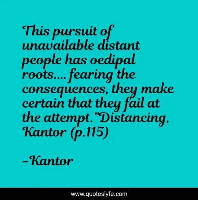 This page presents the quote "This pursuit of unavailable distant people has oedipal roots.… fearing the consequences, they make certain that they fail at the attempt.”―Distancing, Kantor (p.115)". Author of this quote is Kantor. This quote is about longing, love, psychology, kantor, freud, lust, oedipus, passion, affection,.