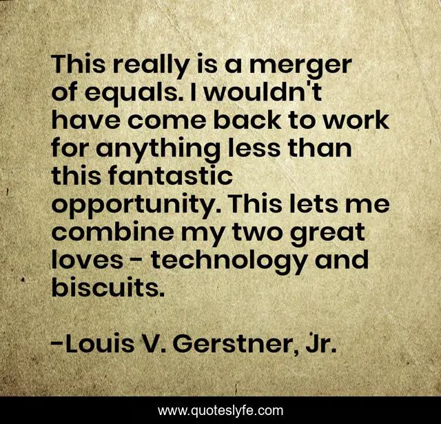 This page presents the quote "This really is a merger of equals. I wouldn't have come back to work for anything less than this fantastic opportunity. This lets me combine my two great loves - technology and biscuits.". Author of this quote is Louis V. Gerstner, Jr.. This quote is about great, work, opportunity,.