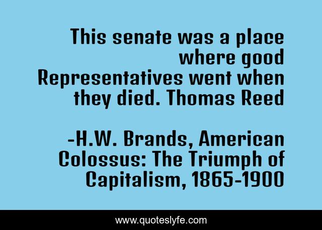 This page presents the quote "This senate was a place where good Representatives went when they died. Thomas Reed". Author of this quote is H.W. Brands, American Colossus: The Triumph of Capitalism, 1865-1900. This quote is about compassion, responsiveness, ambitious,.