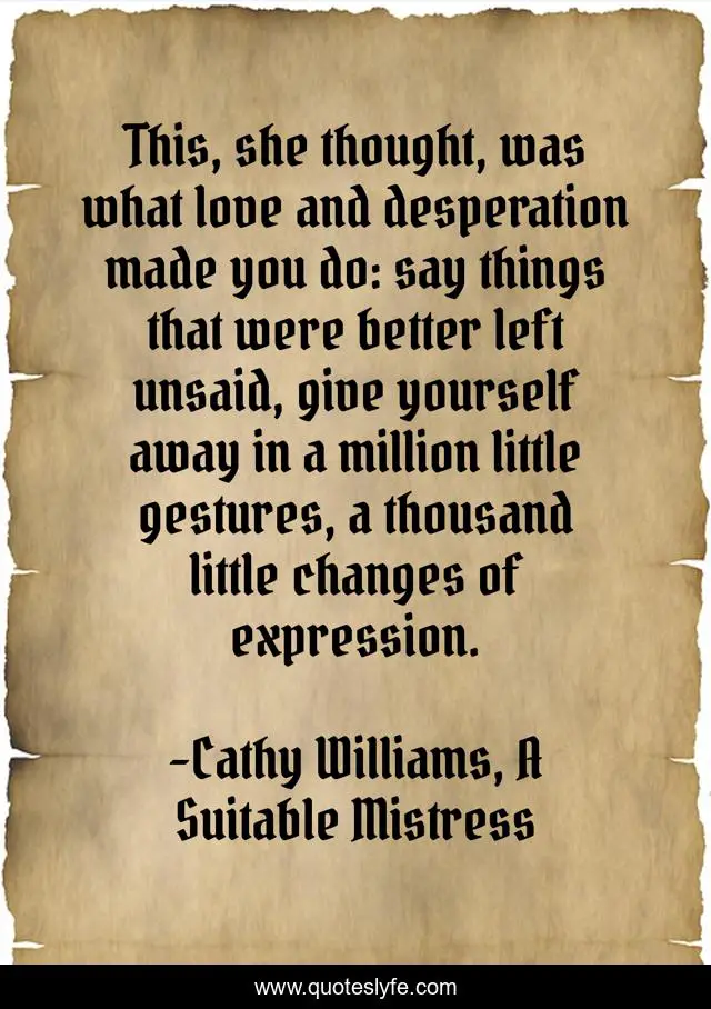 This page presents the quote "This, she thought, was what love and desperation made you do: say things that were better left unsaid, give yourself away in a million little gestures, a thousand little changes of expression.". Author of this quote is Cathy Williams, A Suitable Mistress. This quote is about romance, love, affection,.