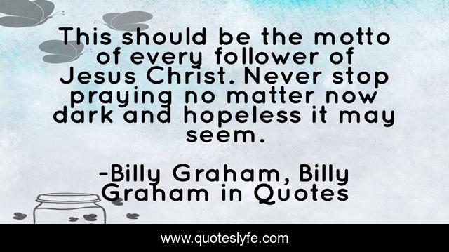 This page presents the quote "This should be the motto of every follower of Jesus Christ. Never stop praying no matter now dark and hopeless it may seem.". Author of this quote is Billy Graham, Billy Graham in Quotes. This quote is about billy-graham, prayer,.