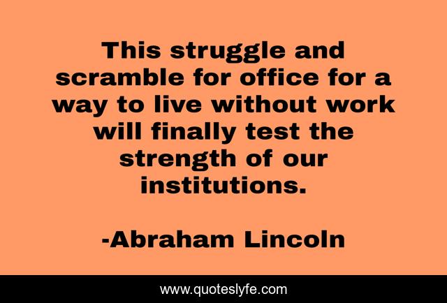 This page presents the quote "This struggle and scramble for office for a way to live without work will finally test the strength of our institutions.". Author of this quote is Abraham Lincoln. .