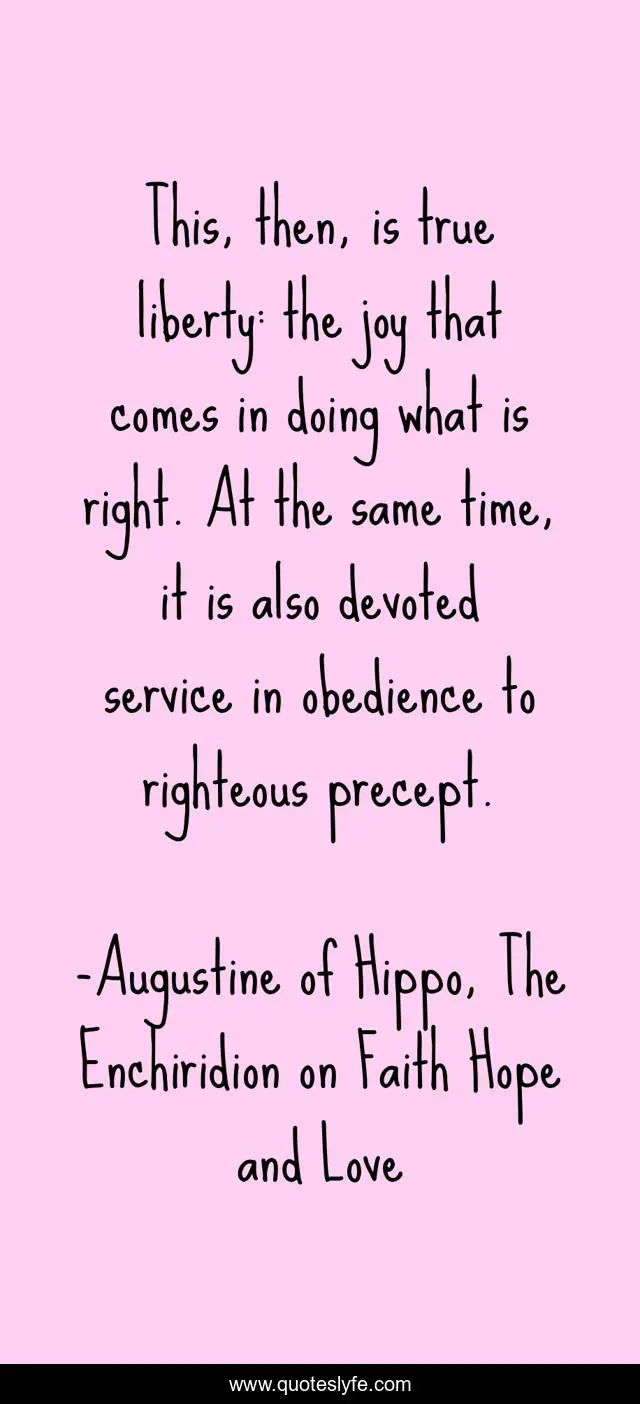 This page presents the quote "This, then, is true liberty: the joy that comes in doing what is right. At the same time, it is also devoted service in obedience to righteous precept.". Author of this quote is Augustine of Hippo, The Enchiridion on Faith Hope and Love. This quote is about freedom, obedience, liberty, joy,.