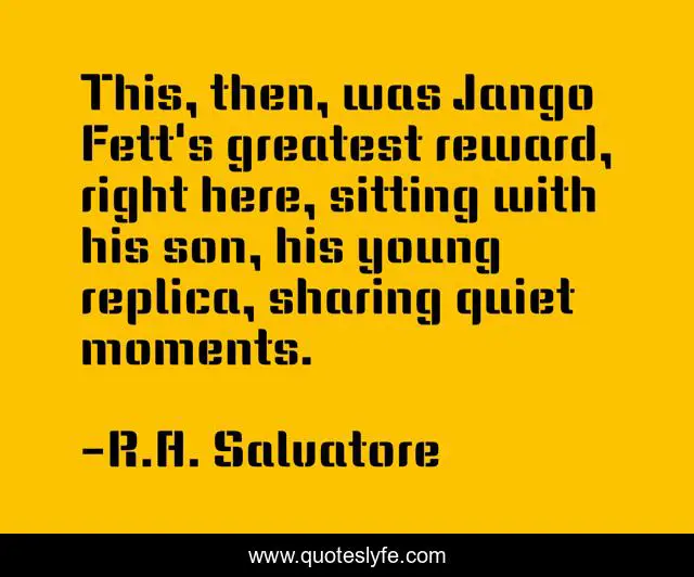 This page presents the quote "This, then, was Jango Fett's greatest reward, right here, sitting with his son, his young replica, sharing quiet moments.". Author of this quote is R.A. Salvatore. This quote is about relationships, boba-fett, jango-fett, father, son,.