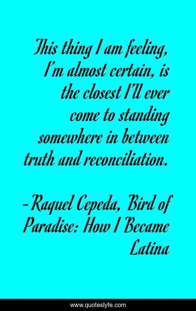 This page presents the quote "This thing I am feeling, I’m almost certain, is the closest I’ll ever come to standing somewhere in between truth and reconciliation.". Author of this quote is Raquel Cepeda, Bird of Paradise: How I Became Latina. This quote is about reconciliation, life, self-awareness, life-lessons, spiritual-journey, sojourn, journey, life-journey, truth,.