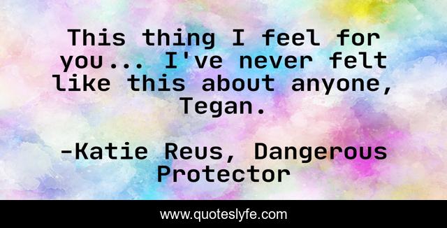 This page presents the quote "This thing I feel for you... I've never felt like this about anyone, Tegan.". Author of this quote is Katie Reus, Dangerous Protector. This quote is about romantic-thriller, romantic-suspense,.