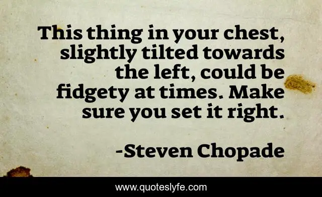 This page presents the quote "This thing in your chest, slightly tilted towards the left, could be fidgety at times. Make sure you set it right.". Author of this quote is Steven Chopade. .