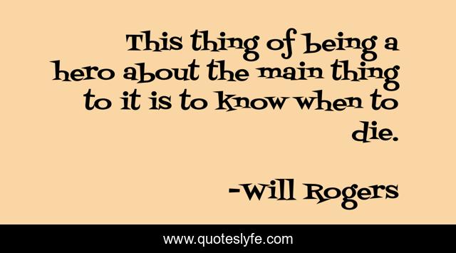 This page presents the quote "This thing of being a hero about the main thing to it is to know when to die.". Author of this quote is Will Rogers. This quote is about heroes, heroism,.