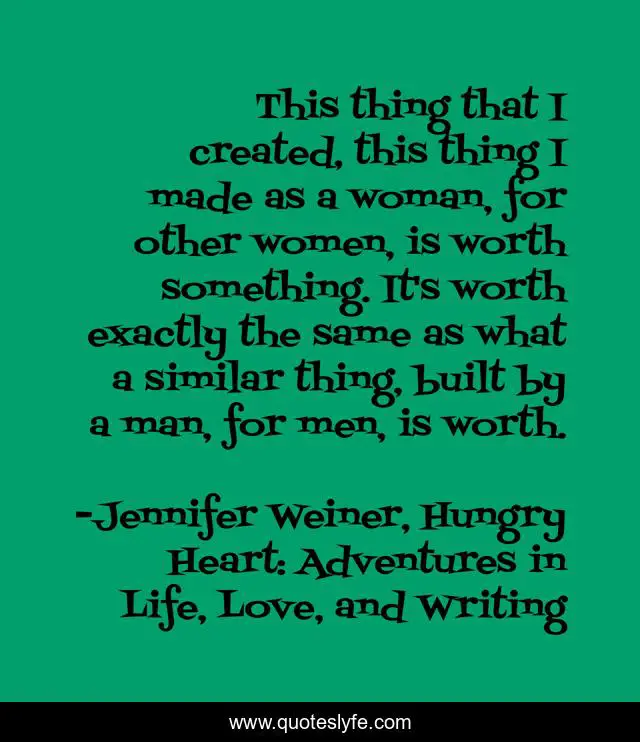 This page presents the quote "This thing that I created, this thing I made as a woman, for other women, is worth something. It's worth exactly the same as what a similar thing, built by a man, for men, is worth.". Author of this quote is Jennifer Weiner, Hungry Heart: Adventures in Life, Love, and Writing. This quote is about women, writing,.