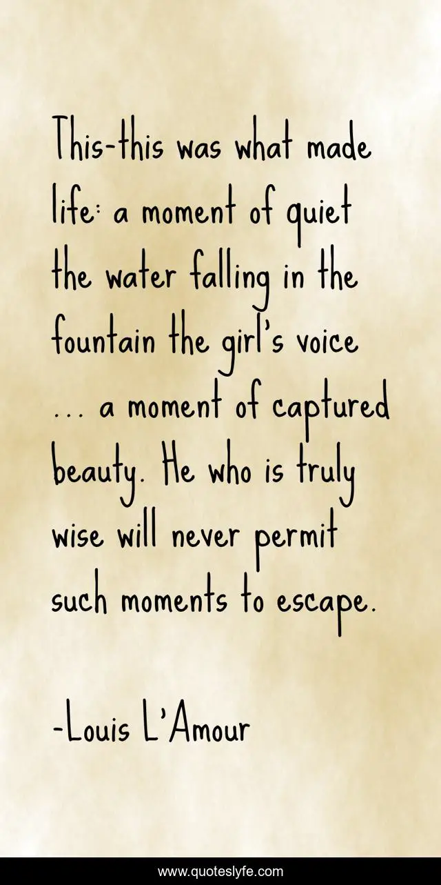 This page presents the quote "This-this was what made life: a moment of quiet the water falling in the fountain the girl's voice ... a moment of captured beauty. He who is truly wise will never permit such moments to escape.". Author of this quote is Louis L'Amour. .