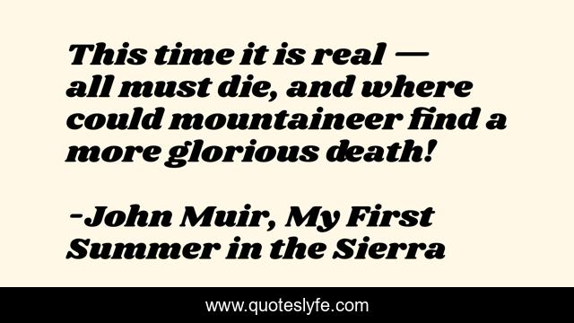 This page presents the quote "This time it is real — all must die, and where could mountaineer find a more glorious death!". Author of this quote is John Muir, My First Summer in the Sierra. This quote is about death, glory, reality,.